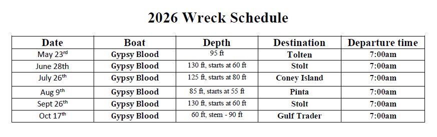 Once you have been out on the Intro-to-Wreck dives, we also offer non-guided chartered dives once a month with the Gypsy Blood. See below for our Wreck Schedule and you can also visit this website, https://njscuba.net/, for a more in-depth look at the wrecks scattered along our shores.